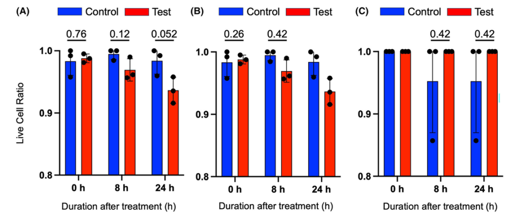 Stymulacja mechaniczna zwiększa odsetek obumierających komórek A431. Liczby podane nad każdym punktem czasowym to wartości P. Każdą wartość P obliczono za pomocą testu t Welcha. Po 24 godzinach wartość P wynosiła 0,052. Odsetek martwych i żywych komórek obliczono dla linii komórkowych: (A) A431, (B) C2C12 oraz (C) L929. Dane przedstawiono jako średnią ± SD dla n = 3.